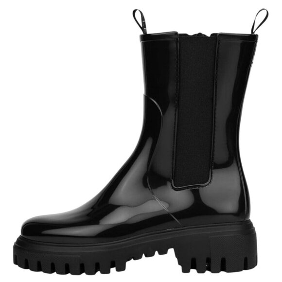 These sleek black Chelsea boots feature a high-shine patent finish and chunky soles. Their elastic side panels ensure a snug fit, enhancing comfort and style.
