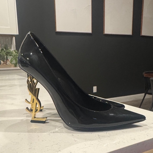 Black Patent Leather Heels with Gold Accent