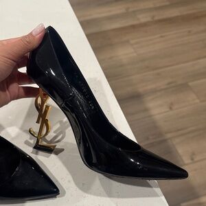 Sleek black heels with iconic gold logo detail. Perfect for a chic look.