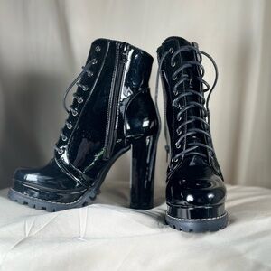 Step out in style with these sleek black patent leather lace-up boots. Perfect for adding a bold touch to any outfit.