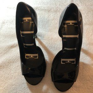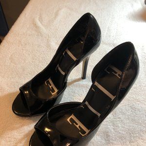 Black Patent Leather Open Toe D'Orsay, lightly worn, excellent condition, size 5, Stiletto 4" heel