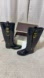 Keywords: rain boots, tall boots, black boots, patent leather, buckle boots, womens boots, stylish rain boots, fashion boots, waterproof boots, rainy day footwear, gold buckle, glossy boots, knee high boots