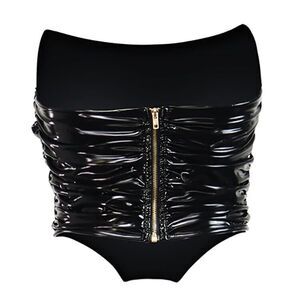 Unleash your inner goddess with this sexy black patent PVC bustier corset. It features a solid pattern and a zipper closure for a sleek and edgy look. The bustier is adorned with accents such as a zipper and is made of blended fabric, with a lightly lined and opaque design.