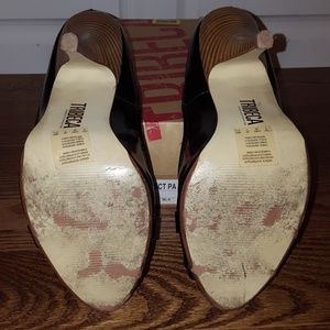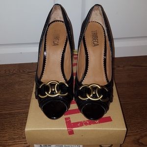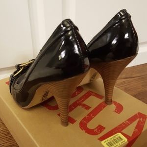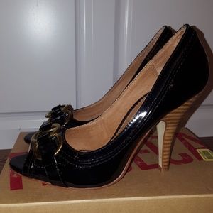 Black patent leather like heels with brass details. Gently worn, in fantastic shape! Original box included.