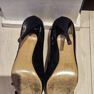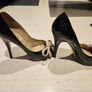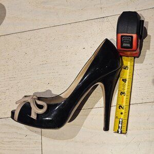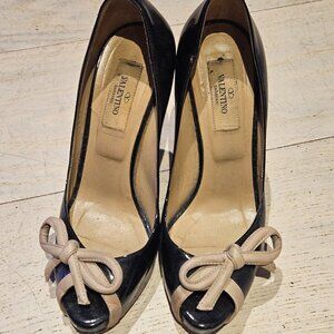 These preloved Valentino Black Patent & Nude Bow Peep Toe Pumps are the perfect pair of neutral, yet quirky shoes for fall! Crafted in a luxurious and subtly glossy black patent leather, these authentic Valentino pumps feature an understated peep-toe and a high stiletto heel. With the ideal amount of padding for added comfort, the insole is made of a buttery-soft leather, and the outsole matches with tonal leather.
