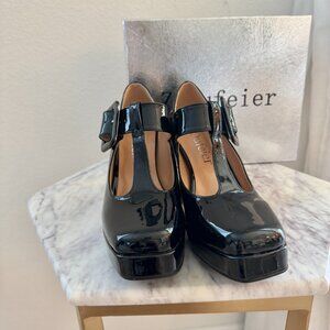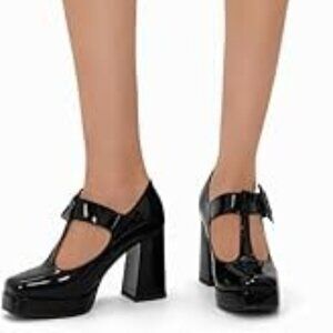 Black Patent Vegan Leather T-Strap Block Heel Mary Jane Shoes with Buckle