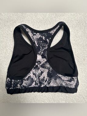 racerback sports bra in black with a gray patterned front panel. Lightweight, breathable fabric wicks moisture for comfortable workouts. Wide elastic band and contoured cut deliver reliable support and a smooth fit. Versatile design for gym sessions or everyday training.