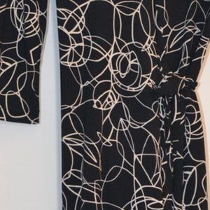 Black BCBG Maxazria wrap dress with white geometric detailing pattern. Full length sleeves. Low V-cut neck.