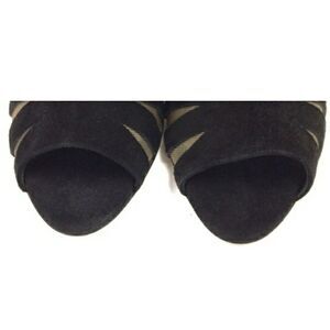 A reinvented peep-toe bootie rendered in rich black suede, featuring graphic cut-outs lined in blush mesh and rising to an elegant 90mm heel height.