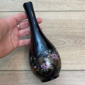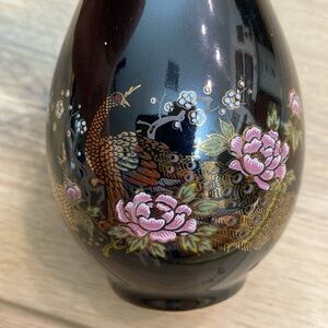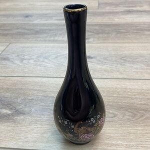 Vintage Otagiri Mercantile Company OMC black glaze small peacock bud vase. A beautiful dark chinoiserie boho accent piece. The delicate shape features gold accents and a botanical scene on the body with peacocks. In excellent condition, no flaws.