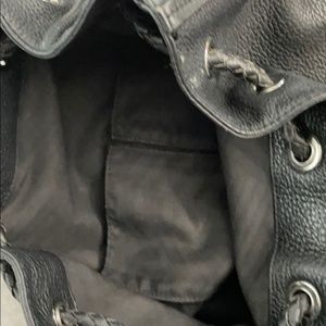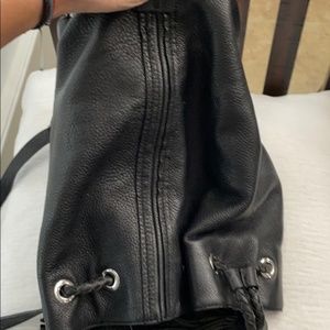 Beautifully soft slouchy pebbled leather black backpack with silver hardware that cinches closed with braided leather tassels. So cute! Pre-loved but definitely has many many more wears! Such an easy casual bag. The base is 10”x5”, top to bottom is 13”, drawstring to base is 11”