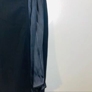 Commanding sophistication emanates from this sleek black pencil skirt, a wardrobe essential reimagined with a touch of modern flair. The skirt's clean, streamlined silhouette gracefully accentuates the figure, ensuring a flattering fit for any occasion. A luxuriously draped satin panel cascades elegantly from the side, introducing an element of refined drama and visual interest. This unique design detail elevates the skirt beyond the ordinary, infusing it with a sense of artistic expression and confident individuality. The skirt is your ticket to mastering that effortlessly polished look. Imagine it gracing your presence during a high-powered business meeting, a chic cocktail party, or an elegant evening dinner.