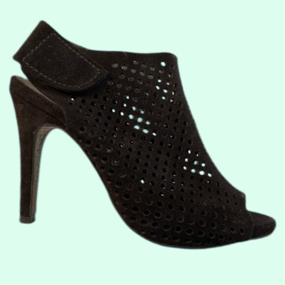 These sleek black high-heel sandals feature a perforated suede design and an open-toe style. With a Velcro strap for secure wear, they elevate any polished wardrobe.