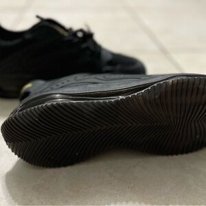 Stylish black sneakers with gold accents. Perfect for sports and casual wear.