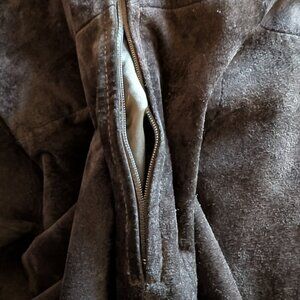 suede feel, full lining, round neckline, flared hem, lined sleeves, fitted waist, the back zipper on the dress is partially