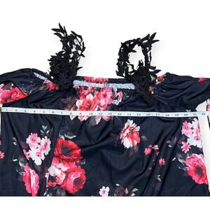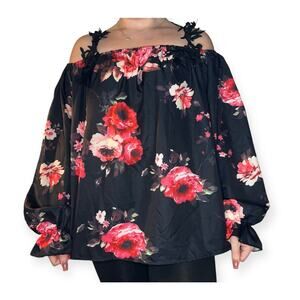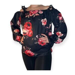 Beautiful and flowy off-shoulder floral blouse featuring a black background with vibrant red and pink roses. Designed with romantic black lace applique straps, long puffed sleeves with elastic cuffs, and a relaxed fit silhouette. Perfect for date nights, casual outings, or dressing up with jeans, skirts, or leggings.