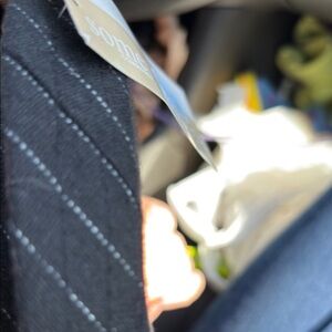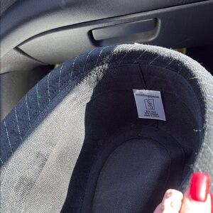 Stylish black hat featuring pinstripes and a bow accent. Perfect for adding a touch of elegance to any outfit.