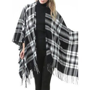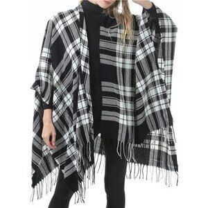 Black Plaid Printed Blanket Shawls Poncho Winter Open Front Wrap Cape Cardigan