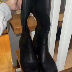 Black leather with wood block heel, fleece lined inside but not too thick, really cozy! Only worn a few times.