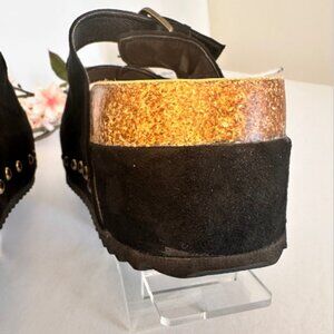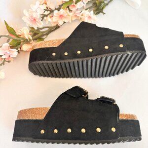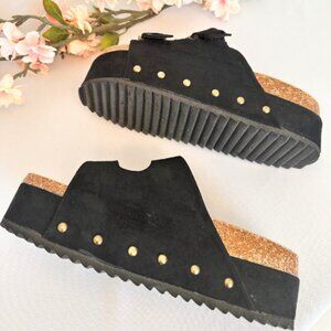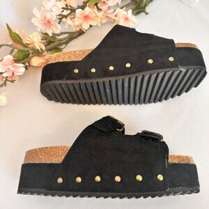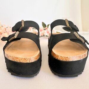 Step into comfort and style with these black, faux suede, platform sandals. These sandals merge the iconic design of classic Birkenstocks with a modern twist, featuring a trendy platform sole that adds a touch of height while maintaining comfort. The faux suede upper provides adjustable straps ensure a perfect fit for all-day wear. Ideal for those who appreciate both fashion and function, these sandals are perfect for casual outings, offering a chic look without compromising on comfort. Embrace a staple that elevates any casual outfit with ease.