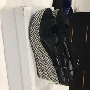 These black platform shoes feature a striking woven sole that adds a unique touch to their design. The slingback style with an open toe and adjustable ankle strap ensures a comfortable fit. Perfect for elevating any outfit with their chic and modern look.