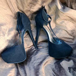 Just Fab black velvety 6" stilettos with a T strap and buckle Liora Platform under ball of foot is 2" so that doesn't make the heel feel so bad. Very sexy Women's size 7 1/2 38 Euro