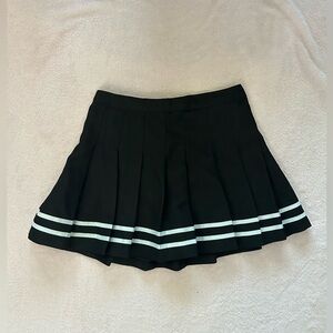Stylish black pleated skirt featuring chic white stripes. Perfect for any occasion.