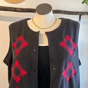 Black Plush Soft Plaid Patchwork Snap Button Sweater Vest Top Size 3X Holiday
