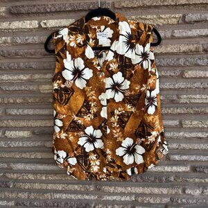 Black Point Hawaiian Brown Barkcloth Hibiscus Floral Ruffle Sleeveless Top