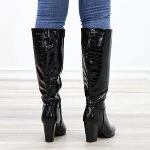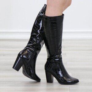 Black Pointy Croc Texture Boot Faux Shiny Leather