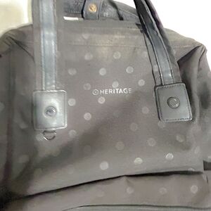 Stylish black backpack with polka dot pattern. Features sturdy handles and a front zipper pocket.