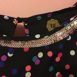 Black dress with pink, white, teal, magenta and darker shades of these colors. It has silver sequins at the collar, and a button to fasten the dress with a hole by it.