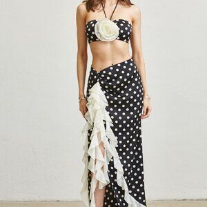 Be an on-trend babe in this two piece set! Our Black Polka Dot Set features halter top with smocked back zipper and high waist maxi skirt with side zipper.