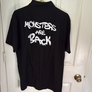 This black polo shirt features a textured knit fabric 50% cotton and 50% polyester. Short sleeve collar polo shirt. The front has an emblem, the back says monsters are back.