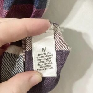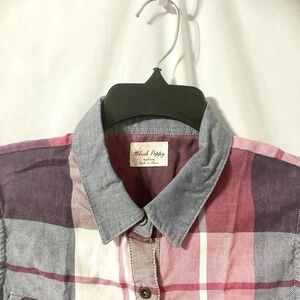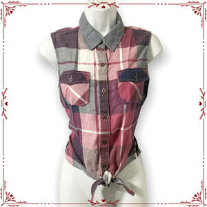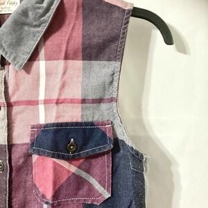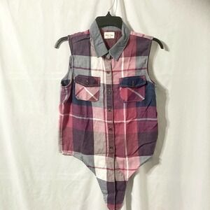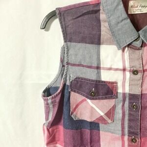 Black Poppy brand from PacSun. Size women's medium. Purple, blue, pink, and white faded plaid button down cut off tank collared sleeveless top. Soft and lightweight material. Double breasted pockets with flap and button closure. Has a cute, grungy, worn look to it. In preloved condition, some fraying along button hem (see photos for condition); as with any preowned clothes, you should wash before wearing the first time. Made of 53% cotton, 41% polyester. From a pet friendly home.