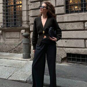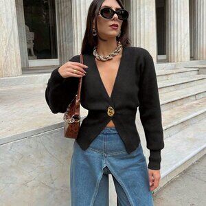 Black Preppy Elegant Minimalist Women's V-neck button detail Sweater Cardigan