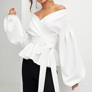 Black Preppy Women Lantern Sleeve Surplice Belted Peplum Off The Shoulder Blouse
