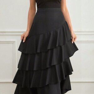 Black Preppy Women's Multi-Layer Ruffle Hem Midi Skirt