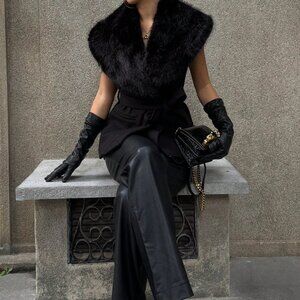 Black Preppy Women's Patchwork Faux Fur Collar Sleeveless Cropped Jacket