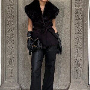 Black Preppy Women's Patchwork Faux Fur Collar Sleeveless Cropped Jacket