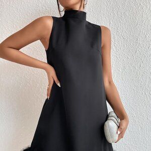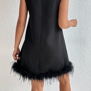 Black Preppy Womens Stand Neck Fuzzy Trim Dress