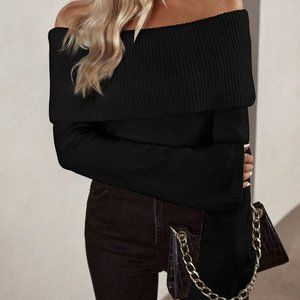 Black Preppy Womens Off Shoulder Fold Over Sweater