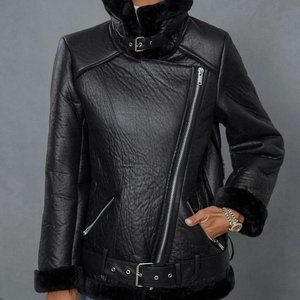 Black Preppy womens Teddy Panel Zip Up Moto Jacket