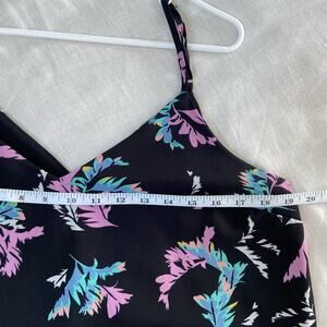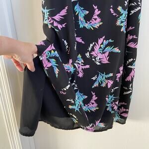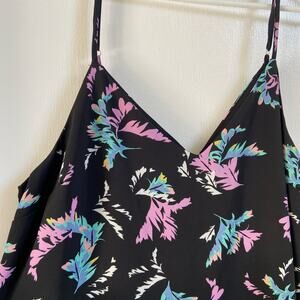 Black tank style dress, spaghetti straps that are adjustable. Pink and blue feather pattern throughout. Back is the exact same as the front. Lining / double layer on the inside. Knee length