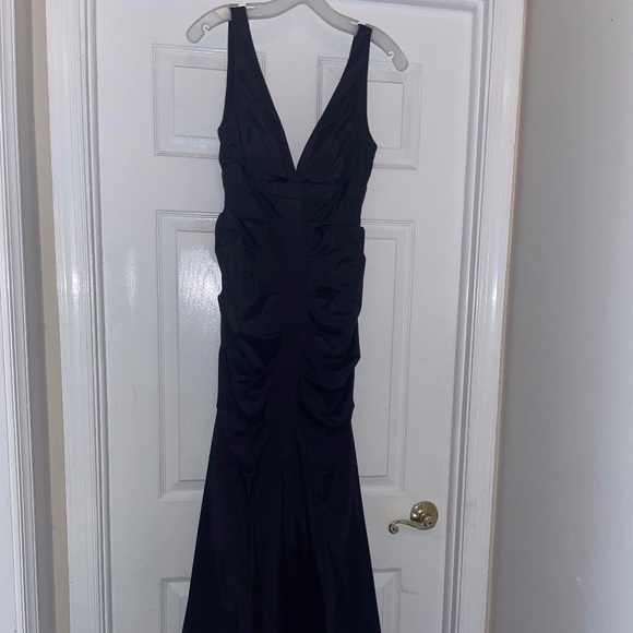 Long Black V-neck dress with rouging through the middle. It was used only one time for a prom but could also be used for other events. It is in perfect condition.