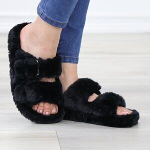 Black Puff Fuzzy Fluffy Slip On Plush Slippers Double Strap