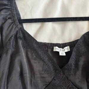 This elegant black blouse features charming puff sleeves that add a touch of romance to its design. The short sleeves and fitted bodice create a flattering silhouette, making it a versatile piece for various occasions.