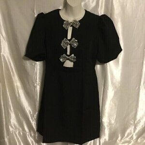 Black Puff Sleeve Cut Out Party Bow Rhinestone Mini Dress L