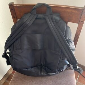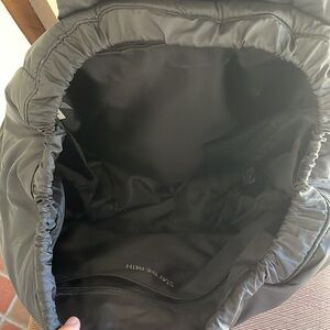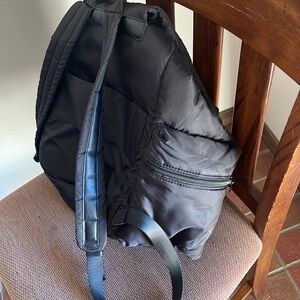 Stylish black nylon backpack with a sleek design. Features a front pocket and adjustable straps. Shown wear on buckle tho still functional