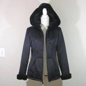 Black Puffer Jacket Hood Faux Fur Trim SMALL